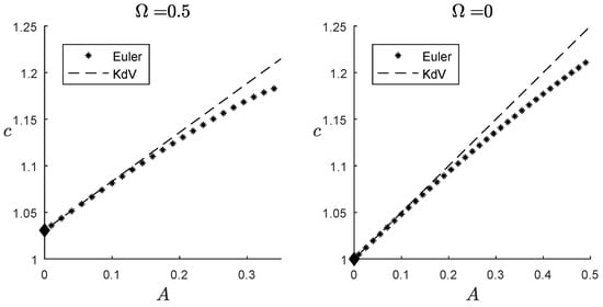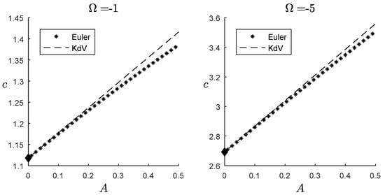 For a given choice of parameters and A, Figure 4 indicates the distance between our solutions and the analytical solution determined by the KdV equation. The dashed line displays the wave speed from the KdV solution after scaling to the Euler regime. As expected, we see a very close wave speed whenever A is small, but the overall pattern of speed/amplitude relation in the case of the Euler solutions present a clear deviation from the linear distribution found in KdV. In particular, around and we see a slight takeoff from the Euler regime in comparison to the KdV, while it is interesting to observe that the general aspect of this “takeoff curve” remains unchanged when we vary . For the interested reader, a study of the resolution of the numerical method is presented in Appendix A.
