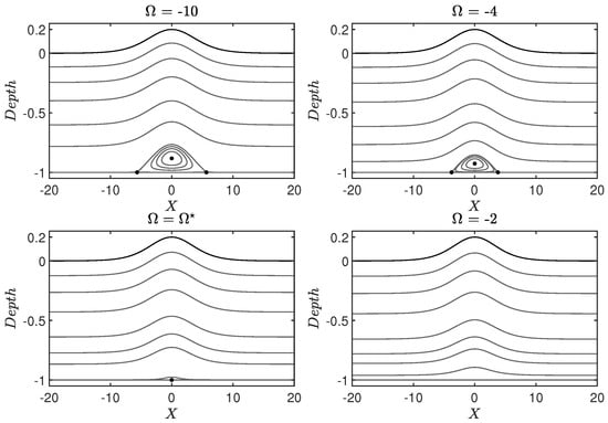 Our first numerical essay consists of computing the phase portrait for different values of the vorticity parameter—this is depicted in Figure 5. The markers represent the position of the stagnation points. We find that the stagnation points first appear on the bottom and below the crest for a critical value . For , there are no stagnation points in the bulk of the fluid. Nonetheless, for , we obtain a flow with three stagnation points: two saddles located at the bottom and one centre located within the bulk of the fluid and below the crest, forming a region with closed streamlines which is described as a single Kelvin cat’s eye structure. As the vorticity becomes stronger, this structure becomes wider, i.e, the saddles remain on the bottom moving away from each other and the centre moves upwards.