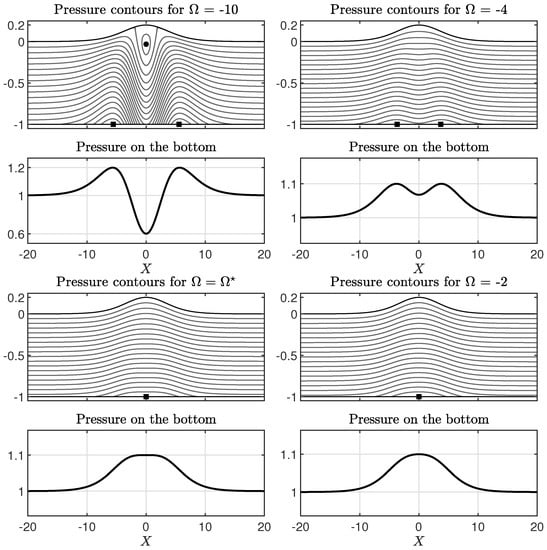 Figure 6 shows the pressure contours and the pressure on the bottom boundary for the same waves depicted in Figure 5. We notice that, according to the value of , the following anomalies occur: (i) the maximum pressure value may not be attained at the bottom and below the crest; (ii) the minimum pressure value may be attained within the bulk of the fluid; and (iii) the pressure on the bottom boundary may have two local maxima. These anomalies have been observed for nonlinear periodic waves [,,] and for overhanging solitary waves [], but to the best of our knowledge this the first time that such results have been reported for solitary waves that are graph of a function. These results indicate that the anomalies in the pressure and the stagnation points are somehow related. Moreover, pressure anomalies and stagnation points occur when a threshold vorticity is achieved. However, a detailed theoretical study is necessary to explain such a phenomenon.