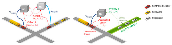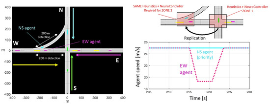 A two-way intersection is chosen as a simple use case as shown in Figure 8. Traffic is generated stochastically at each road and lane leading to the intersection. The intensity of traffic is generated using a Monte Carlo-based agent generator, with a probability function deciding when and if an agent is created while assigning it an initial speed and length. Each agent is created 500 m from the intersection and assumes the cohort is fully formed (see [31] for reference on formation strategies). Once entering the intersection 200 m detection zone, the heuristics assign a priority. Per concept 2, once assigned a priority level 2 or above, an agent would receive one to two prioritized (level 1 or levels 1 and 2) agent information to modulate its speed. Additionally, when on the same road and lane, an agent uses the Gipps driver model [32] to maintain a safe gap to any other agent in front of it. This limits its maximum speed and rear-ending events. The Gipps model uses the same comfortable acceleration and deceleration as the NeuroController. The Gipps model relies on a safe distance and speed computation: