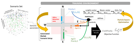 Training environment setup: for all Design of Experiment scenarios, the agent-based simulation is run and the objective function output. The PSO algorithm adjusts each particle’s information defining the controlled agent NeuroController to minimize the objective function. Note that the activation function vector was added in a later step.