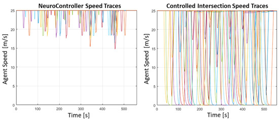The NeurcoController drastic reduction in speed fluctuation is shown in Figure 10. A maximum speed decrease of 10 m/s is required in contrast to the stop-and-go behavior of the controlled intersection.