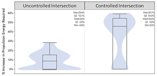 Increased propulsion energy required to operate a 15,000 lbs vehicle at the uncontrolled and controlled intersections when compared to a steady state operation at 55 mph across the DOE scenarios.