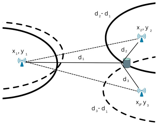 A technique called Time Difference of Arrival (TDOA) is used in wireless communication systems to pinpoint the position of a device by comparing the times at which signals arrive at various receivers. In the context of the Internet of Things (IoT), TDOA can be used for location-based services and device tracking. The device’s position may be determined by triangulating the times at which different receivers receive signals. TDOA may also be used in conjunction with other location techniques, such as Angle of Arrival (AOA) or Received Signal Strength Indicator (RSSI), to increase location accuracy and robustness [32,33].