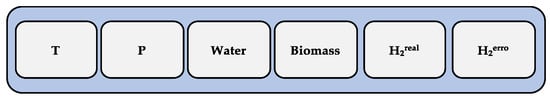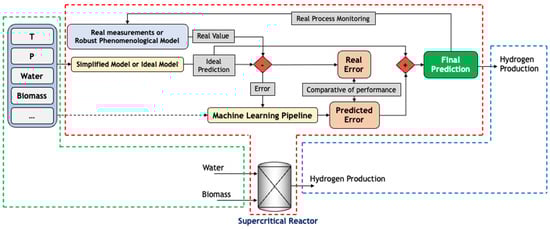 The simplified model uses basic inputs to calculate the variable of interest; in this case, the production of hydrogen in the equilibrium condition. Using real process data or data simulated by a more rigorous phenomenological equation, the error of the predictions will be calculated using Equation (41). The second part of the proposed architecture corresponds to the use of a data model that will receive several input values—which may be the same used in an ideal first-principle model—and use them to predict the errors calculated previously.