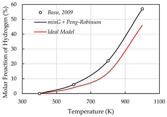 Comparison of experimental results reported by Basu (2009) [39] concerning results calculated using the Gibbs energy minimization methodology with the Peng–Robinson equation and the ideal model.