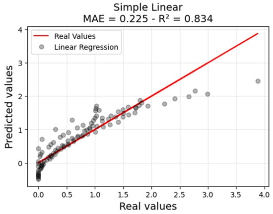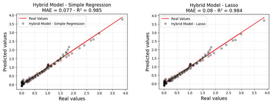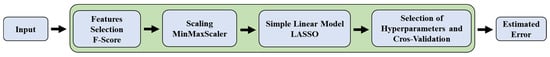 Considering that one of the objectives of this work is to show the advantages of less complex data approaches, two modeling algorithms were chosen as the first options to model the errors of the ideal model concerning the real data. Two linear regression approaches were selected because they have good generalizability and are easy to interpret [44]. Linear regression models will be used through the LinearRegression class and LASSO regression from the Lasso class, both from the scikit-learn library. Equation (42) presents the generalized form of a linear model.