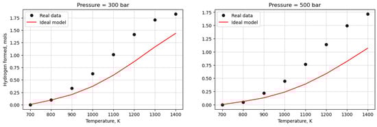Comparison between real and simulated data considering the reaction system as ideal, fixing 1 mole of biomass with 5 moles of water in the feed for pressures of 300 and 500 bar.