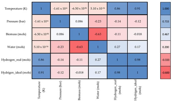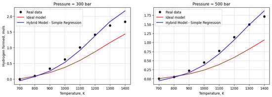 The first step of the proposed architecture of this work consists in making predictions of the production of hydrogen in the equilibrium condition, considering the system as ideal—i.e., using the Clapeyron equation (Equation (40)). Note that ideal behavior is not consistent with what is studied, considering that the critical water pressure is greater than 220 bar [6,8,36].