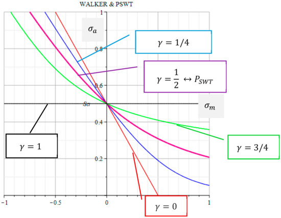 Figure 2 demonstrates the dependence of the cycle amplitude on the mean stress according to Walker, which leads to a certain fixed fatigue life. Each curve matches to a certain value on the parameter