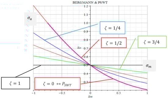 Figure 3 displays the Bergmann dependence of cycle amplitude on the mean stress, which leads to the equal fatigue life. According to Equation (5), each curve corresponds to a certain value in the parameter