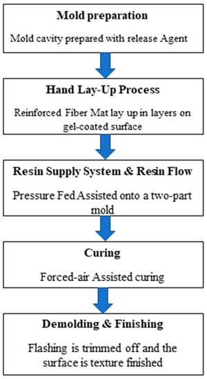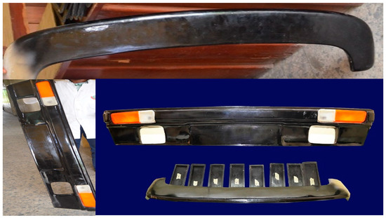 Polypropylene-g-MAH (graft copolymer of PP and maleic anhydride compatibilizer) was pelletized with a ratio of 10% to 60% fiber content (fiber size < 1 mm) using an intermeshing, co-rotating, twin-screw extruder for the injection molding process. The basic plastic processing techniques were carried out for the injection molding samples’ development. The ejected samples were developed using processing conditions at 180 °C (feed zone), 195 °C (transition zone), and 200 °C (metering zone), along with an injection rate between 10 cm3/s to 20 cm3/s and injection pressure of 150 MPa to 170 MPa. On the other hand, RTM was applied for the fabrication of composite samples integrating reinforced kenaf long bast fibers (1–8 cm) at a ratio of 10% to 60% with unsaturated polyester, epoxy resins, and epoxy hardener (Figure 1). Three different automotive parts were fabricated from the RTM composite samples: the boot spoiler, bumper, and test pies sample. However, samples were made from both processing techniques according to the ASTM test requirements.