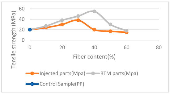 The experimental results of tensile strength in Figure 3 show that the fiber content significantly affects the mechanical properties of the composite material. There is significant strength enhancement at 30% optimal fiber content for injected parts (38 MPa) and at 40% optimal fiber content for RTM (55 MPa) due to the reinforcing effects of the fibers. As the fiber content increases, the tensile strength of composite material continues to increase as fiber shows well-dispersed and good reinforcement. However, at higher fiber contents of more than 30% for injected parts and more than 40% for RTM, the tensile strength decreases drastically due to the increased stiffness and brittleness of the composite material. The obtained results are pertinent to previous studies [40]. Moreover, in injection molding, kenaf fibers degrade at higher temperatures, which affects mechanical properties [41]. The mechanical strength of the reinforced material is also associated with the morphology/chemical composition of the fiber, and specific processing techniques used to incorporate the fiber in the matrix (resin) could also influence its properties and tensile strength. The mechanical properties of fibers also increased with the level of fiber purity and cellulose content of the fiber in the reinforced composite material. In RTM, liquid resin was injected into the mold containing reinforcement material, and the resin was cured under heat and pressure. In injection molding, the resin was injected into the mold and rapidly cooled to solidify the material. These phenomena are supposed to lead to different tensile strengths of the resulting parts. Overall, the differences in mechanical properties between RTM and injection-molded parts are largely due to the different manufacturing processes and the resulting microstructure of the materials that exert differences in tensile strength.