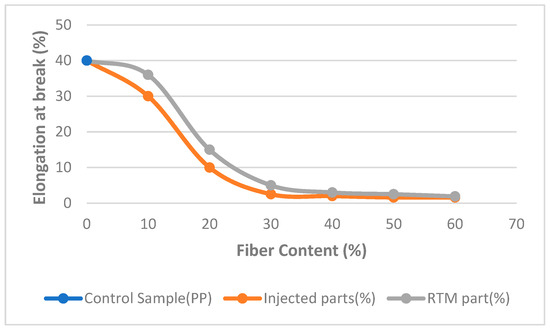 Figure 4 shows the elongation at the break of the composite samples with varying fiber content. At a lower fiber content (10%), the elongation at the break was not significantly affected due to the toughening effects of fiber acting as a reinforcement. As the fiber content increases from 20% to 60%, the elongation at the break decreases significantly due to an increase in the stiffness of the composite material by creating a stress concentration leading to microcracking and failure in the material, which is pertinent to the previous study [40]. The figure also demonstrates that RTM parts showed a higher level of elongation at the break all the way. This is because RTM is a thermoset process, which means that the resin cures at a specific temperature and time. This allows for the formation of a more uniform microstructure, which can also contribute to the higher elongation at the break of RTM parts. Moreover, the higher elongation at the break of RTM parts is due to a combination of factors, including uniform fiber impregnation and controlled curing. These factors contribute to the formation of a more ductile material, which is better able to withstand deformation before it breaks.