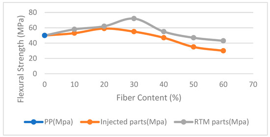 Figure 5 shows that at a lower fiber content (10%), the effect on flexural strength was limited for both the RTM and injected parts. Maximum flexural strength was recorded at 20% and 30% fiber content for the injection-molded and RTM samples, respectively. However, as the fiber content increases, the flexural strength decreases due to the increased stiffness and brittleness of the composite material. At higher fiber contents (40–60%), the flexural strength of the composite material decreases significantly, which is in line with the previous study [42].