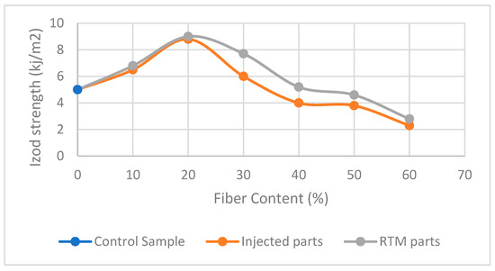 Fiber content shows a significant effect on the impact strength (Figure 6). At a lower fiber content of (10%), the impact strength of reinforced composite material for both the RTM and injection-molded parts showed slight reinforcement improvement. At a fiber content of 20%, the strength was significantly improved. However, as the fiber content increases above 20%, the impact strength decreases due to the increased stiffness and brittleness of the composite material. At 40–60% fiber content, the composite material showed a gradual decrease due to poor fiber dispersion, higher misalignment, and higher free volume, which leads to stress concentration and defect in the material, which is in line with the previous study [43].