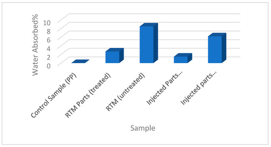 The effect of water absorption was observed to be more significant with the untreated fibers used in the reinforced composites than with those that contained treated fibers (Figure 7). The control samples showed no significant moisture as a non-polar material. Cellulose, in nature, is a polar material consisting of three hydroxyl(-OH) groups that form strong hydrogen bonds with water molecules, creating a partial negative charge on the oxygen atom and a partial positive charge on the hydrogen atom. These tendencies give cellulose a high affinity for water, primarily because it absorbs and holds onto water molecules [44,45]. Figure 7 shows that composite with a higher fiber content (40% of RTM) absorbed less water than composite with a lower fiber content (30% of injection-molded) and composite with untreated fibers, which is pertinent to the previous study on kenaf fiber composites [44].