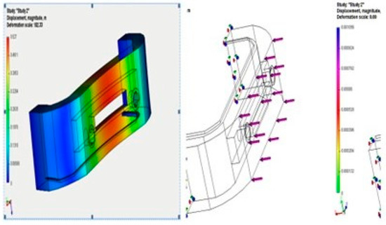 The bumper and boot spoiler application simulation was performed for the injection molding process, as shown in Figure 8, to predict crashworthiness during a collision. The central portion showed significant stress, while other areas showed low stress and strain. A low strain resulted in a material that is relatively stiff and resistant to deformation, while material with a higher strain resulted in material that is more pliable and easier to deform. The strain shows a relationship with the fiber orientation and alignment of the fibers in the composites. Randomly oriented fibers will have more isotropic mechanical properties, with similar stiffness and strength in all directions. Reinforced parts have higher stiffness and strength in the direction parallel to the fibers than in the direction perpendicular to the fibers. This is because the fibers provide reinforcement in the direction of their alignment and resist deformation in that direction. The simulation concludes that the central portion of the injection-molded sample will have comparatively more stress than other portions of the part.