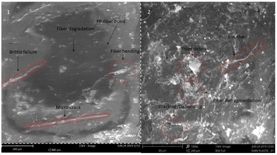 The morphology of the injection-molded composite material was investigated through SEM/EDX. Figure 9 shows surface irregularities, including brittle failure, fiber bending, micro-cracks, debonding, fiber debris, fiber defragmentation, pull-out fibers, and fracture areas in the parts. The thermo-oxidation degradation phenomena, along with fiber degradation due to higher temperature, brings about the reduction in molecular mass and, consequently, mechanical performance characteristics of the composite materials.