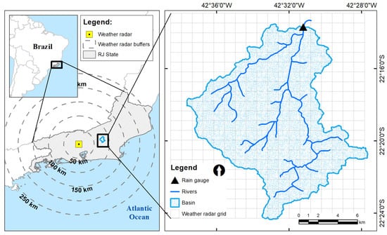 13]. In this context, weather radar data provide reflectivity data, converted to rainfall rates and integrated for a while to estimate the volume of water that falls in the watershed. Therefore, it provides a more accurate estimation of accumulated rainfall for smaller areas than satellite-based rainfall missions. On the other hand, accurate rainfall data from rain gauges/pluviometers require a high-density network of pluviometers to cover the watershed area, which is usually unavailable.