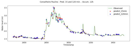 Experiments refer to the proposed neural network predictions of the river level at the outlet of the Bengalas river watershed (Conselheiro Paulino station). In the 15 min model, current radar data at time t are used to predict the river level at time t + 1 (15 min ahead), and in the 120 min model, to predict the river level at time t + 8 (120 min ahead). Both models were generated by the neural network with the same architecture, hyperparameters and partition scheme, and their performance prediction was evaluated for accumulated volumes of rainfall for 1, 2, 6, 12, 24, and 48 h.