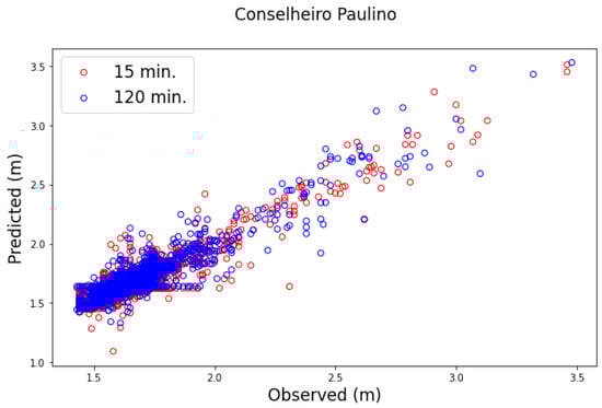 Figure 4 shows the scatter plot of the predicted and observed values of the Bengalas river level (in meters) at the watershed outlet for 15 and 120 min forecasts, which show a good correlation, mainly for low and medium values.