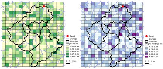 Figure 5) and the smallest horizontal distance between the center point of the radar cell and the drainage network. As shown on the graphics of