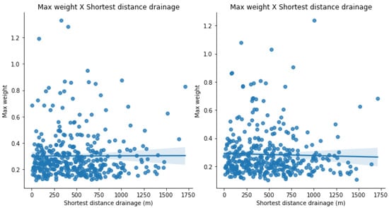 A second analysis was made comparing the minimum, maximum, average and sum of weight values with the ground model HAND (height above nearest drainage), which corresponds to a topographical normalization of the landscape that uses the digital terrain model (DTM) as input and provides as output, a new normalized DTM, which can be classified according to vertical distances relative to watercourses that are close ([