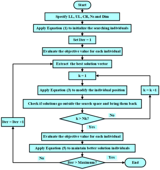 A choice probability (CR) of 50% is maintained to create an equilibrium between the exploratory features and the improved exploit qualities as stated in Equation (3). Figure 1 depicts the critical phases of the proposed ASABA. As displayed in the first step in the flowchart in Figure 1, there are three control parameters of the suggested ASABA algorithm which are: the choice probability), the population size (Ns) and the maximum number of iterations.