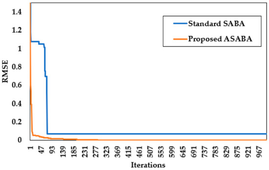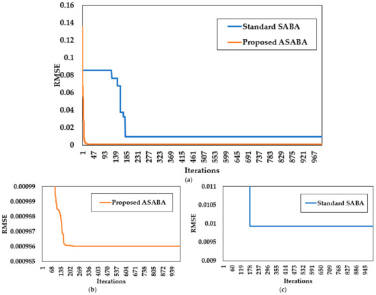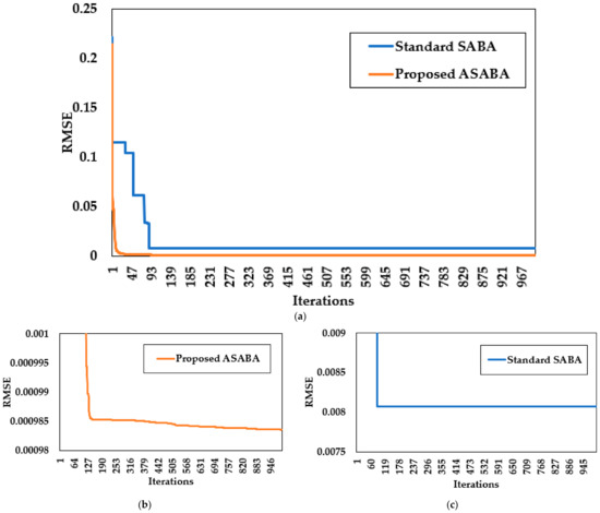 From Table 1, the suggested ASABA produces a substantially lower RMSE value of 9.8602 × 10−4 than the traditional SABA approach, which obtains an RMSE value of 0.00993415. As a result, the suggested ASABA approach outperforms the traditional SABA technique by 90.1%. Also, Figure 4 displays the convergence patterns corresponding to the suggested ASABA and traditional SABA strategies. As shown, the suggested ASABA technique continues progress in reducing the RMSE objective, compared the traditional SABA method. As demonstrated in the zooming part of SABA in Figure 4c, the SABA technique becomes stuck very early at the 185th iteration at a local minimum RMSE value.