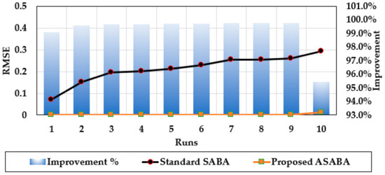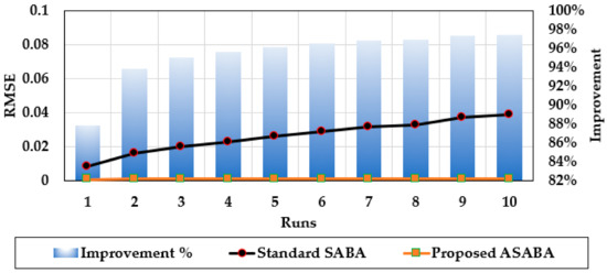 Moreover, for the PVSD, Figure 10 displays the obtained RMSE targets for the separate runs regarding both the suggested ASABA and traditional SABA strategies. As shown, great superiority is declared due to the suggested ASABA. It shows a very high improvement compared to the traditional SABA strategy with 99.1%, 99.6%, 99.7%, 99.7%, 99.7%, 99.7%, 99.7%, 99.8%, 99.8% and 95.4% for the different separate executions.