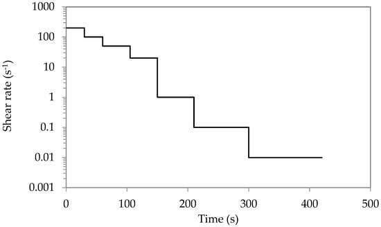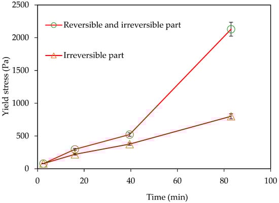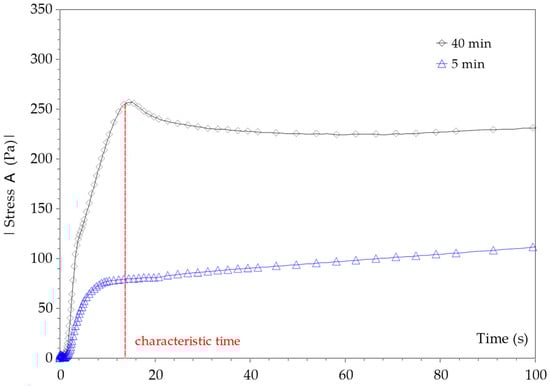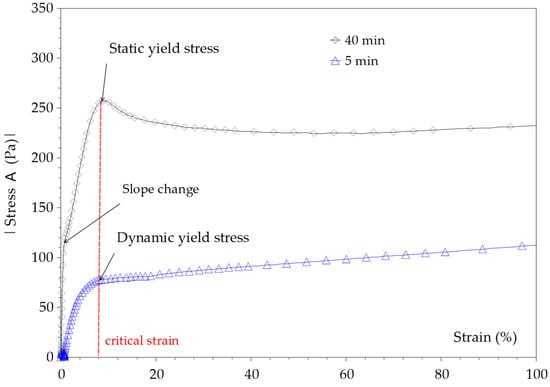 Various testing procedures and approaches have been reported in the literature. The first procedure, called the hysteresis loop, consists of applying an increasing and decreasing shear rate. The area between the ascending and descending curve is an indicator of the thixotropy. This method can be used as a preliminary attempt to assess the thixotropy [65,66]. In fact, the hysteresis area depends not only on time but also on shear history (shear rate, test condition, step duration). The most common test consists of the measurement of the static yield stress (using the stress growth procedure) after different resting periods [20,21,67,68]. The slope of the yield stress–resting time curve (Athix) is a strong indicator of the structural build-up. Another interesting method is based on time sweep measurements using small-amplitude oscillatory shear (SAOS). It consists of the determination of the evolution of both the storage and loss moduli with rest time [21,22].