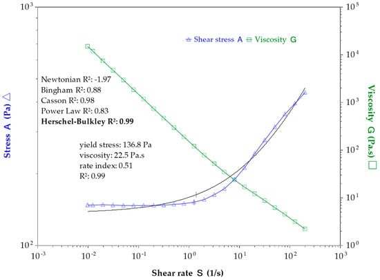 As presented in Figure 2, several laws allow for fitting the flow curve. However, for non-Newtonian and yield stress fluid such as cement paste, the flow behavior can be described by the Casson law as well as by the Herschel–Bulkley model. This latter is widely used for cement paste behavior and is defined as follows:
