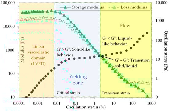 The amplitude sweep can be performed by applying an increasing stress (or strain) at a frequency of 1 Hz [17,19,23]. The typical response of amplitude sweep is presented in Figure 3. It is worth noting that this kind of non-destructive test allows the microstructure of fresh cement paste to be probed [17,27,31]. As shown in Figure 3, the evolution of storage and loss moduli during an amplitude sweep follows three phases. The first phase in which the moduli remain almost constant is defined as the linear viscoelastic domain (LVED). In this domain, the microstructure of cement paste is maintained [27]. The SAOS procedure allowing the structural build-up to be characterized is commonly performed in this strain region. In addition, cement paste will behave like a solid if the storage modulus G′ is greater than the loss modulus G″. The liquid-like behavior corresponds to G′ < G″. The end of the LVED is characterized by a significant drop of the moduli. The strain associated with this decrease onset is of the order of 10−2% and can be interpreted as a signature of the breakage of the links between cement particles (C-S-H links and attractive colloidal forces) [17,23,27,29,32].