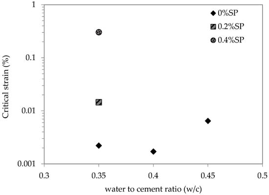Effect of water-to-cement ratio (w/c) and superplasticizer dosage on the critical strain (data from [17]).