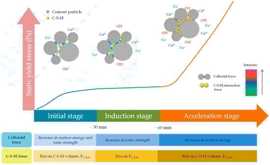Zhang et al. [68] showed that the interparticle force, which is the combination of the colloidal force and interaction force between C-S-H particles, is the driving force for the evolution of static yield stress. The contribution of colloidal force appears to be greater in the early period (the initial and induction period), while the C-S-H force determines the evolution trend of the static yield stress since the induction period.