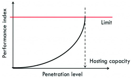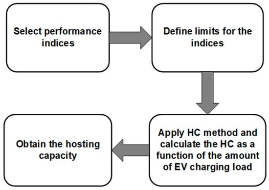 Hosting capacity concept, illustrated in Figure 1, was first introduced in March 2004 [7] as a concept in electrical power systems and was later defined as the amount of new production or consumption that can be connected to the network without risking the reliability or power quality of other customers [8,9]. The HC calculation methodology shown in Figure 2 usually begins by selecting one or more performance indices (PI) such as voltage drop, voltage unbalance, equipment loading, system losses, and harmonics. This is followed by defining a suitable limit for the selected PI as specified by national or international regulatory standards and then applying HC determination methods to estimate the HC of EV charging [10,11]. This will guide the choice of a maximum number of EVs that can be integrated into a distribution network without violating the operational limits of such a network.