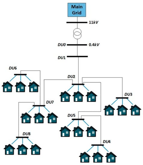 The test LV distribution network used for this study is part of an eThekwini power grid. The studied area is a housing development in Durban, South Africa consisting of 21 high-income homes, each with the potential for owning EVs. Figure 3 shows a single line diagram of the studied grid. The grid is supplied by a 350 kVA 11/0.41 kV Dyn11 transformer, and the cable characteristics are detailed in Table 1. Every household represents a customer and is evenly allocated on a customer distribution unit (DU) resulting in three customers per DU. It was assumed that each customer is capable of connecting only one EV to the grid.