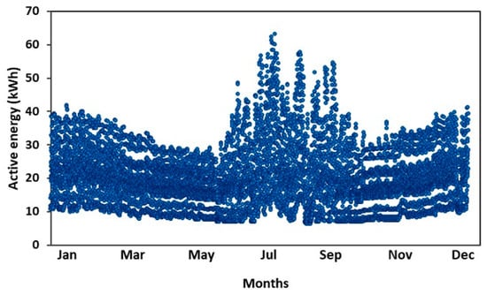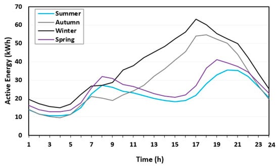The historical time-series load data available for the studied grid are one calendar year (2021) measured hourly average active energy (kWh) for all the 21 customers in the distribution network obtained from the eThekwini Municipality, the distribution network operator. Figure 4 shows the aggregated historical time-series load data used to model the studied grid with peak consumption observed in July. Figure 5 shows the seasonal load profile across each season of the year. It can be observed that the highest consumption occurred during the winter season, with 15 July 2021 being set as the critical day with the highest consumption, which is subsequently used as the simulated period for single-phase EV charging HC assessment. Since information about the load consumption of individual households is not available and all customers are assumed to be of the same class with the same consumption pattern, the load scaling method is applied to estimate the load for each consumer. Load scaling is a top-down method of estimating the load distributed along a feeder, to sum up to the known measurement at the beginning of the feeder. It is a standard feature in DIgSILENT PowerFactory 2022 software.
