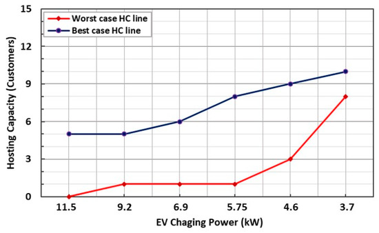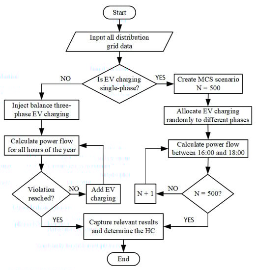 This case study evaluated the impact of three-phase EV charging, estimates the HC and examined how the HC changes throughout the year and how the location of EV charging affected the change. Historical load data for all hours of the year were used to conduct the power flow simulations. The EV charging power (11 kW and 22 kW) was added to each household and was simulated as a constant power load, balanced across the three phases. EV charging power was added to one customer at a time for every simulation based on the priority list for either the worst-case or best-case scenario. The process was iterated until the first violation of either voltage or loading limits, and the HC was obtained.