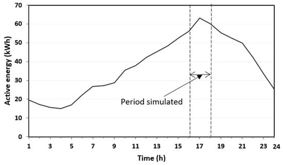 This case study assessed the impact of single-phase EV charging on the LV distribution network and estimated the HC. A stochastic method was adopted with phase selection as the only uncertainty considered. A simplified MCS first introduced in [23] for PV hosting capacity studies that use minimum available data and reduces simulation time was adapted and used in this study. The method was used to randomly assign the phase to each customer at every addition of the EV charging load. Three power flow simulations were performed for each scenario for the period of interest (critical day), indicated in Figure 7 (1 h resolution from 16:00 and 18:00). According to [24], EV charging will have the greatest impact on the distribution grid when there is peak household demand. Therefore, this period with the highest consumption throughout the year was chosen, and it was assumed that if there was no violation during this period, it was likely that there would not be in other periods. The procedure was repeated for 500 MCS scenarios and the result of interest was captured.