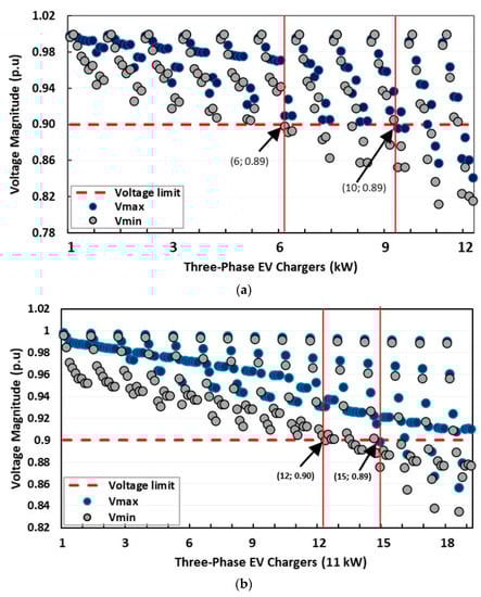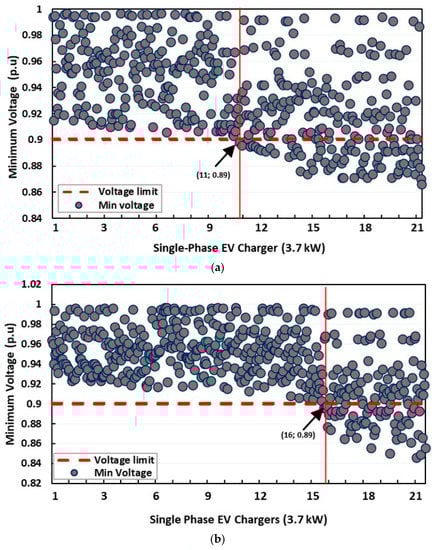 The voltage profile in the network when EVs are connected for the worst-case and best-case scenarios is shown in Figure 8a,b, respectively. The scattered plot demonstrates the relationship between the maximum and minimum feeder voltages at each busbar and the penetration of EV charging in the test LV network. Each dot in the figures shows maximum and minimum voltages at the different busbars in the network as the allocation of EV charging is gradually increased. It is observed that an increase in the penetration level of EVs () decreases the feeder voltages towards the lower limit. For the worst-case scenario shown in Figure 8a, the first violation is observed at 29% when six customers are simultaneously charging. Due to load variations, more customers can charge at hours of lower household load demand until both minimum and maximum voltages exceed the limits when nine EVs (43% ) are simultaneously charging. At this point, there will always be a violation, irrespective of the time of year. Figure 8b shows the best-case scenario where the first violation is observed at 57% , when 12 EVs are simultaneously charging. At 71% (15 EVs simultaneously charging) and beyond, there will always be a violation for every hour of the year.