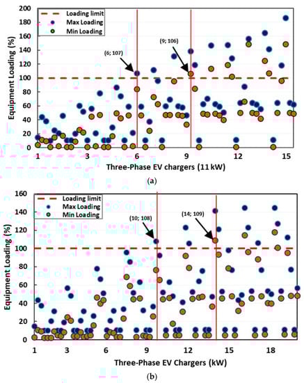 The scatter plot in Figure 9a,b shows the maximum and minimum equipment loading for the worse-case and best-case scenario, respectively, for all the hours of the year simulated as the is varied. The equipment considered are the cables and the transformer and the dots represent the maximum and minimum values for each during the period of simulation. It is observed that increasing the penetration level result in a corresponding increase in the equipment loading towards the allowable limit. In the worst-case scenario in Figure 9a, the first violation at 108% equipment loading is observed at 29% when six customers are simultaneously charging their EVs. More customers can charge at hours of lower household load demand until both minimum and maximum equipment loading exceed the limits when nine EVs (43% ) are simultaneously charging. The best-case scenario in Figure 9b shows the first violation at 107% equipment loading when 10 customers (48% ) are simultaneously charging. At 67% (14 customers) and beyond, there will always be a violation for every hour of the year.