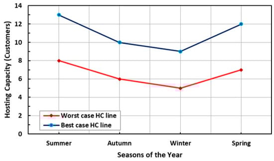 The range of values for the hosting capacity of the balanced three-phase network obtained from the impact assessment conducted is 5–8 customers and 9–13 customers for the worst-case and best-case scenario, respectively. This range is generally considering all hours of the year and all the performance indices. However, further analysis is carried out to estimate the seasonal and yearly variations in HC values.