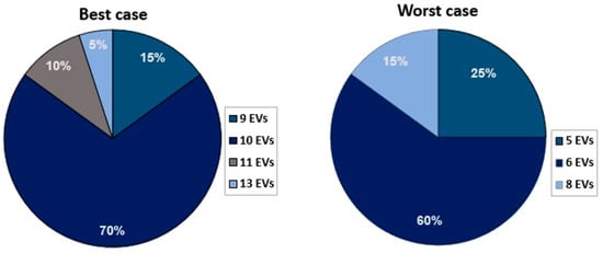Figure 10 shows the seasonal variation in HC for the best-case and worst-case scenarios. The test network can host more customers (13 and eight for best-case and worst-case scenario, respectively) with EVs during the summer while the fewest number of EVs can be connected during the winter. Figure 11 shows the fraction of the year with the number of EVs that can be hosted simultaneously in the network without violating any performance limit. The pie charts include results from all hours of 2021. During the best-case scenario, nine and 10 customers can be hosted simultaneously for 85% and 70% of the hours, respectively. Moreover, five and six customers can charge their EVs simultaneously for 85% and 60% of the year, respectively, during the worst-case scenario without violating the limit of any PI.