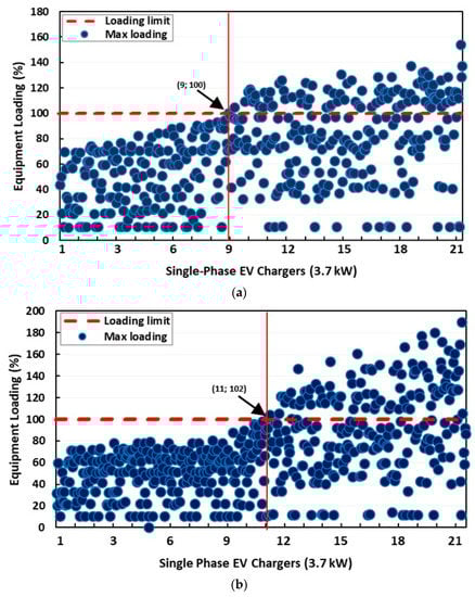 The scatter plot in Figure 13a,b shows the maximum equipment loading anywhere in the network for the worst-case and best-case scenario, respectively, and each dot represents an MCS scenario. It is observed that increasing the penetration level results in a corresponding increase in the equipment loading towards the allowable limit. During the best-case scenario in Figure 13a, the first violation at 100% equipment loading is observed at 43% when nine customers are simultaneously charging their EVs. The best-case scenario in Figure 13b shows the first violation at 102% equipment loading when 11 customers (52% ) are simultaneously connected to the network.