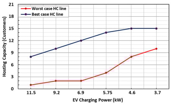 The hosting capacity of the unbalanced single-phase network obtained from the impact assessment conducted for different charging powers is shown in Figure 14 and Figure 15 for voltage drop and equipment loading, respectively. In Figure 14, the HC with a charging power of 3.7 kW, is 48% and 71% (10 and 15 customers) for the worst-case and best-case scenario, respectively, when voltage drop is the PI considered. The HC reduces to 9.5% and 57% at 6.9 kW charging power. When considering equipment loading as the PI in Figure 15, none of the customers can charge their EVs with an 11.5 kW charger during the worst-case scenario, while five customers can charge during the best case. The HC is zero and five customers for the worst case and best case, respectively. Moreover, for the popular 3.7 kW charger, the HC is eight customers for the worst-case and 10 customers for the best-case scenario. Table 2 shows a comparison of the HC values for worst-case and best-case scenarios when considering both PIs, with equipment loading as the most limiting PI. The difference in HC values between the two scenarios in this case study also highlights the effect of the charging location on the HC of single-phase EV charging.