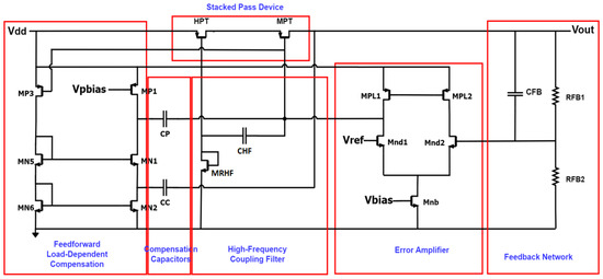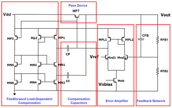 Figure 2 shows the compensation circuit added to provide a path for the supply noise to the pass device gate to have high-frequency noise coupling. It presents a modified circuit for the design proposed in [23]. Mainly it pushes current through the circuit depending on the load current that flows through the pass device, providing the load-dependent feedforward compensation.