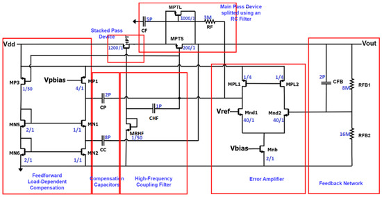 The LDO loop gain analyses with the feedforward loop are derived based on the LDO shown in Figure 2. As the load current increases, the feedforward loop gain Avff increases due to higher gm,MP1 as shown in (11). This helps in amplifying the supply noise on the gate of the pass device and improving the noise cancellation with a higher PSR at the high-frequency path. The LDO output shown in (3) becomes a function of the feedforward path gain through CP as Equation (10) shows.