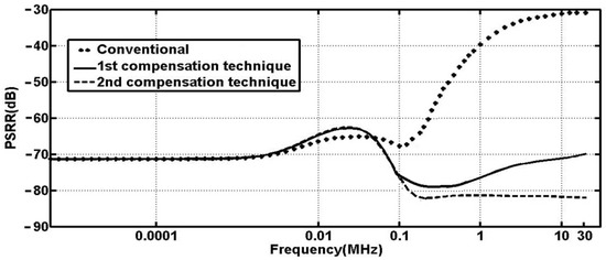 Figure 7 shows the PSR improvement at 100 kHz, 1 MHz, 10 MHz, and 30 MHz of each stage of compensation. The numbers are shown in Table 1.